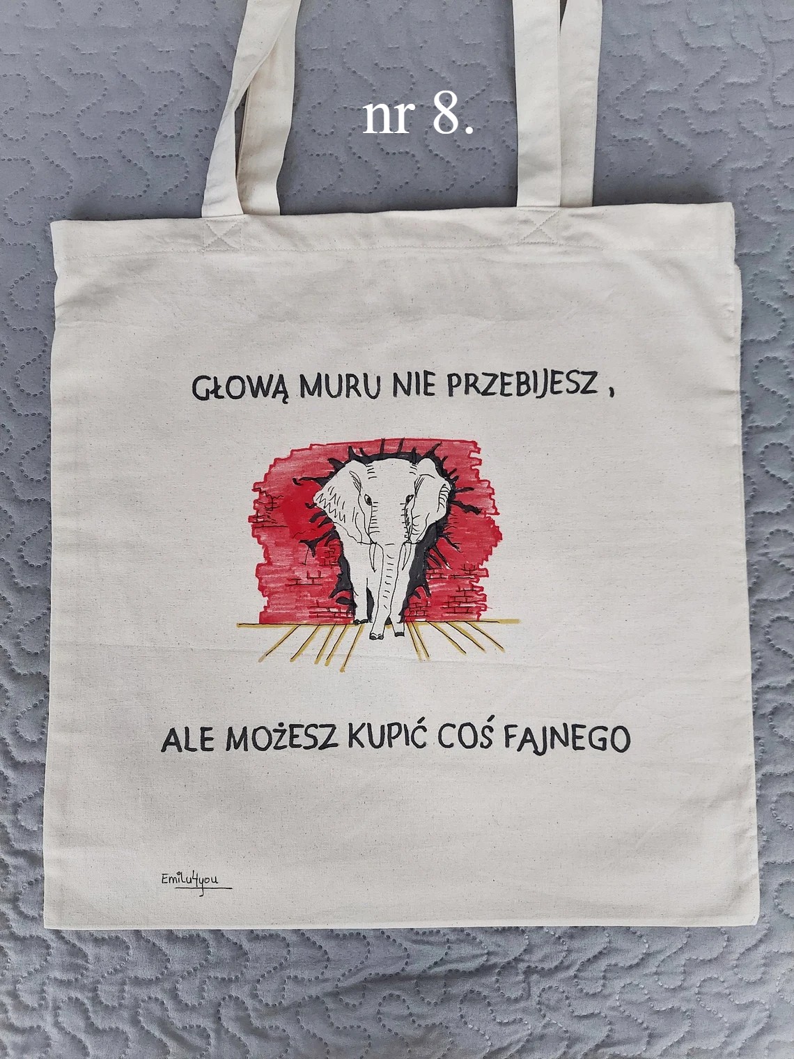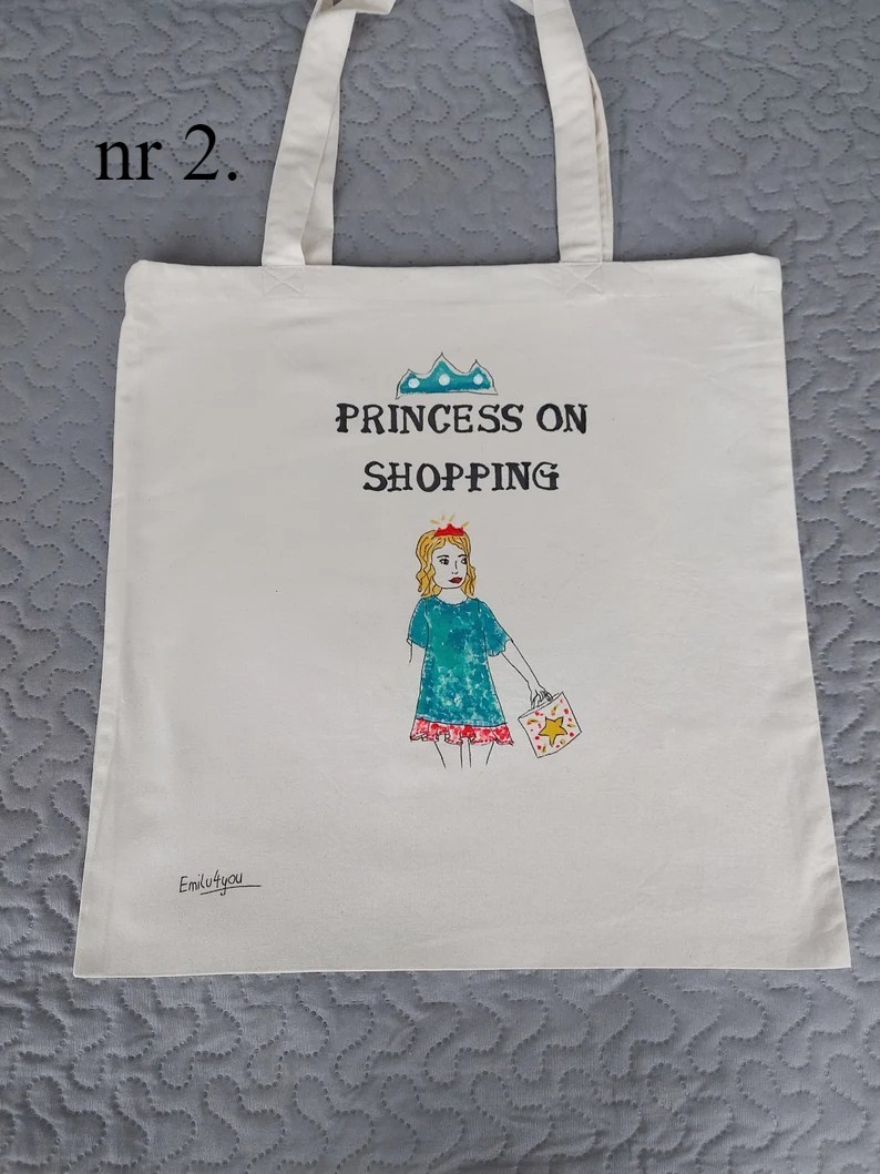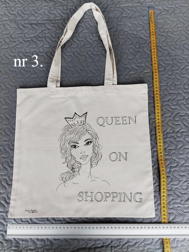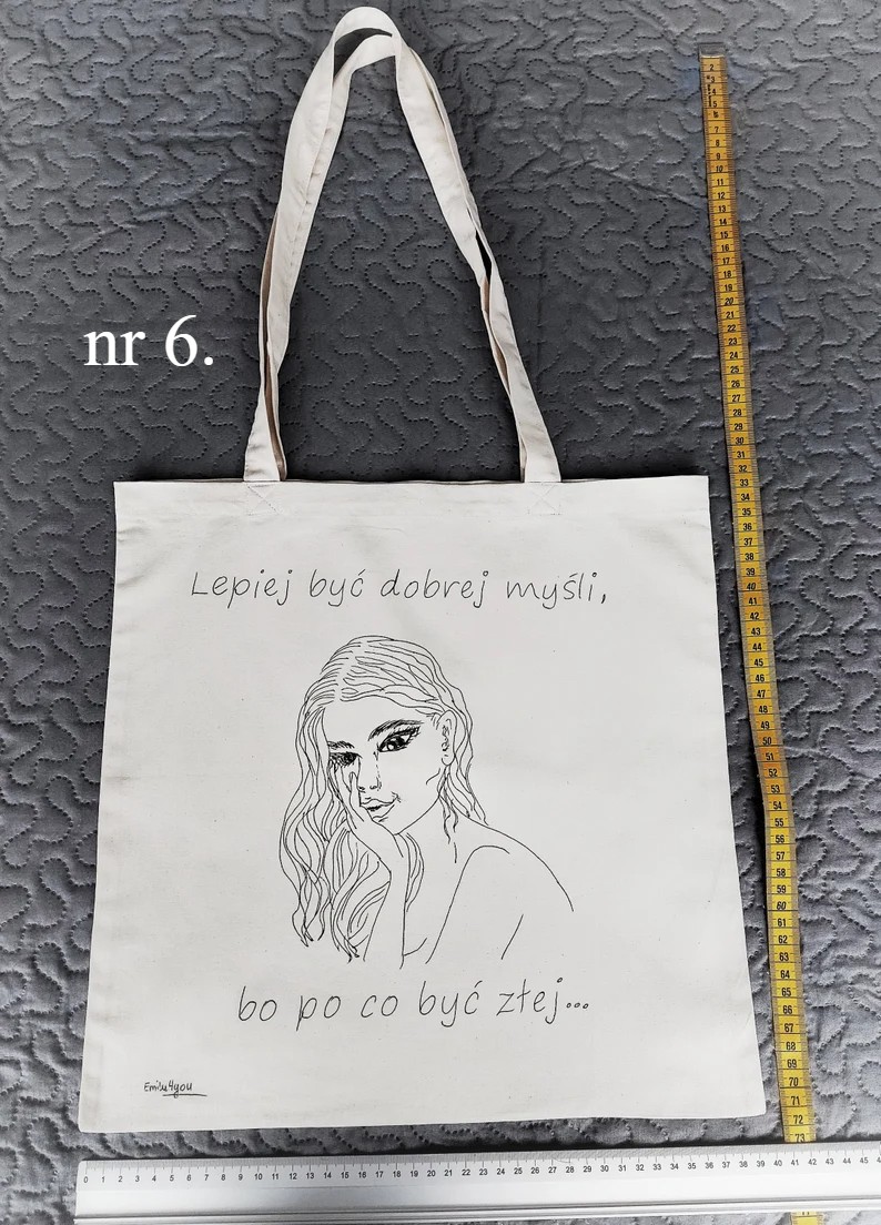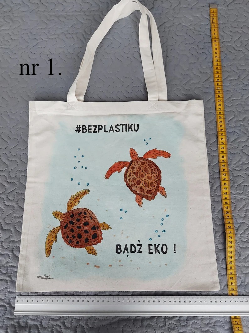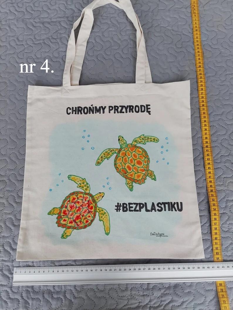 Bawełniane torby na zakupy z ręcznie malowanym obrazkiem. Wymiary 40x40cm (+/- 3cm) Długość rączek - ok 60cm (+/- 3cm) - widoczne na zdjęciach. Siatki można prać w temperaturze 30 stopni C, dla zachowania trwałości koloru, nie wybielać, prasować po lewej stronie.