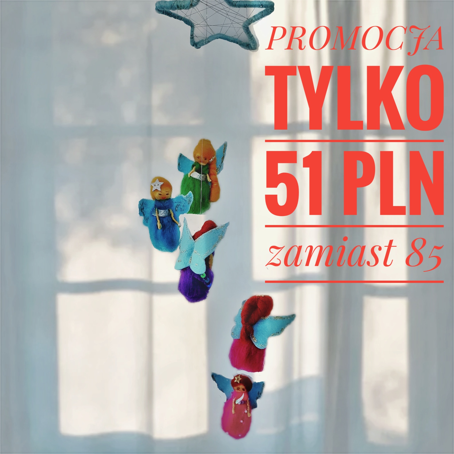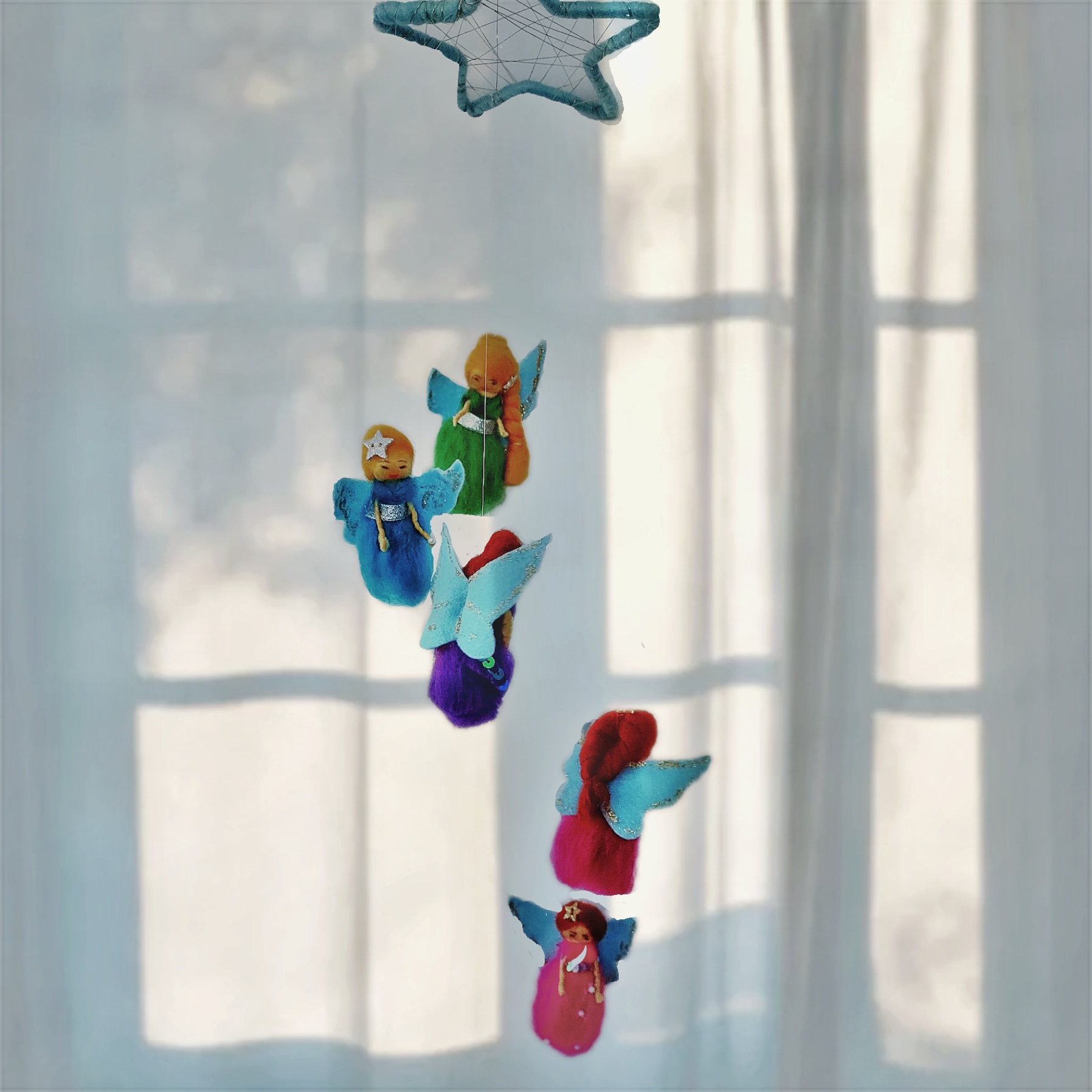 Dekoracja do pokoju dziecięcego - karuzela z pięcioma wróżkami została wykonana ręcznie. Powstała tylko 1 sztuka, więc jest to produkt wyjątkowy. Dzięki ruchom powietrza karuzela wiruje, a wróżki poruszają się tak, jakby latały. Elementy są umocowane tak, aby dziecko widziało postacie, a nie tylko doły sukienek. Całość jest bardzo lekka. Wróżki wykonane są z wełny czesankowej, a gwiazda z lekkiego metalu, pokrytego również wełną.