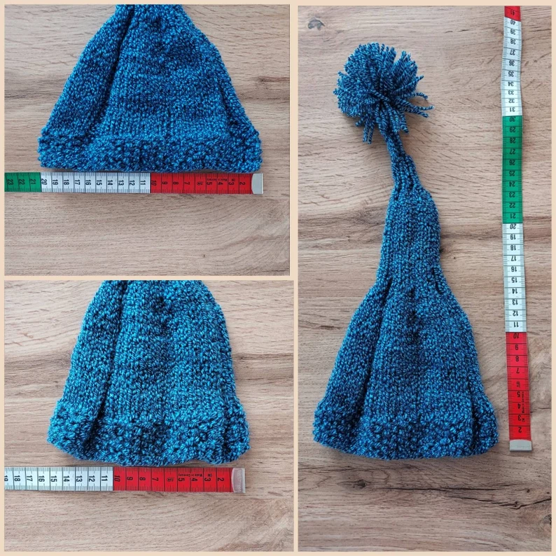 Tym samym sposobem została wykonana czapka. Wymiary na zdjęciach przedstawione są bez rozciągania i po lekkim rozciągnięciu. Zakres obwodu głowy 30-46 cm. Odpowiednie dla dziecka od narodzin do ok 1-go roku życia.