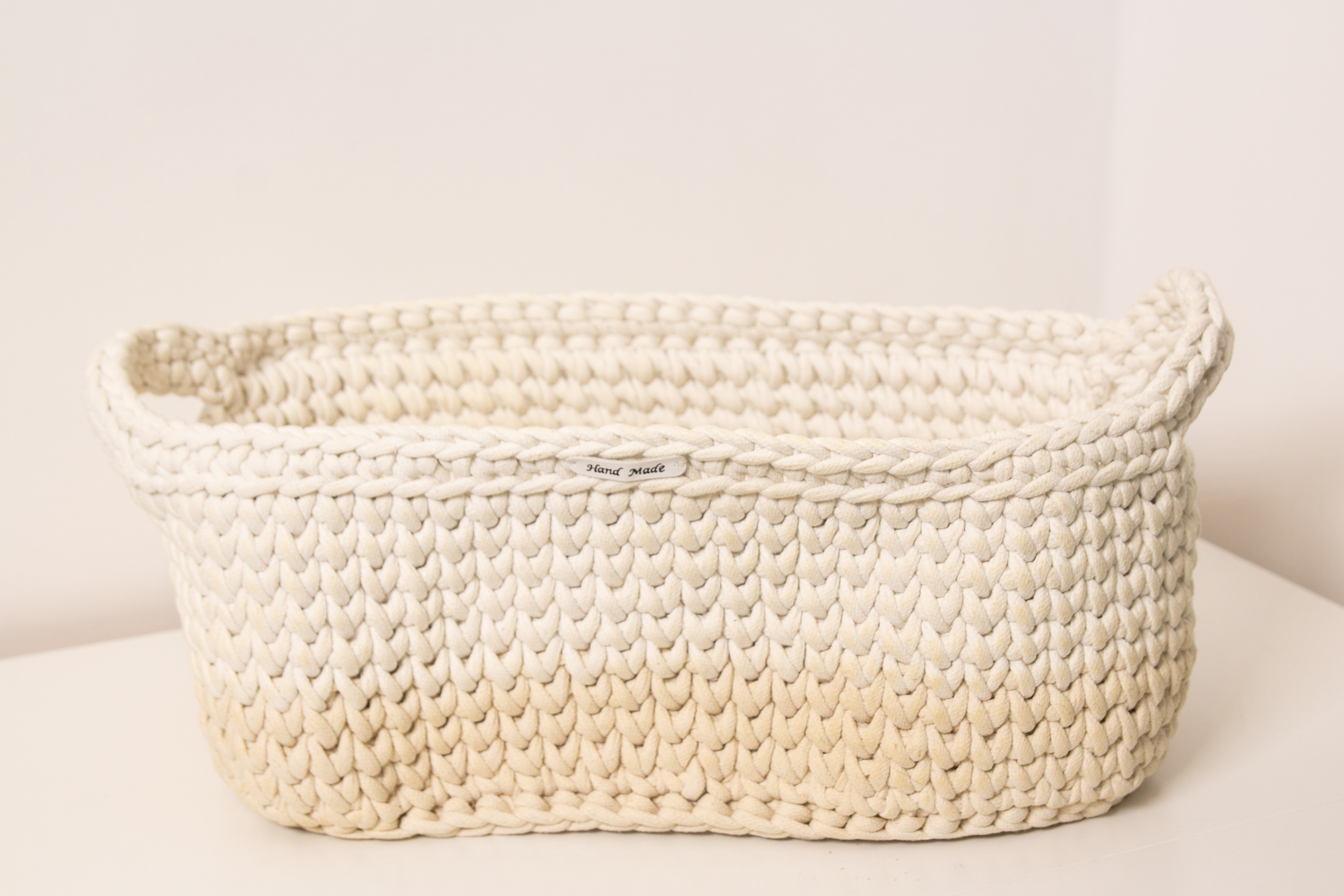 Bawełniane kosz z uszami został zrobiony z bawełnianego sznurka z poliestrowym rdzeniem, dzięki czemu splot jest bardziej wytrzymały. Dół kosza jest beżowy, natomiast góra to mleczna biel z odcieniami beżu. Wymiary długość41-43 cm, szerokość 23 cm, wysokość 17-18 cm. Kosz można prać w temperaturze 30 stopni C, dla zachowania trwałości koloru, nie wybielać.